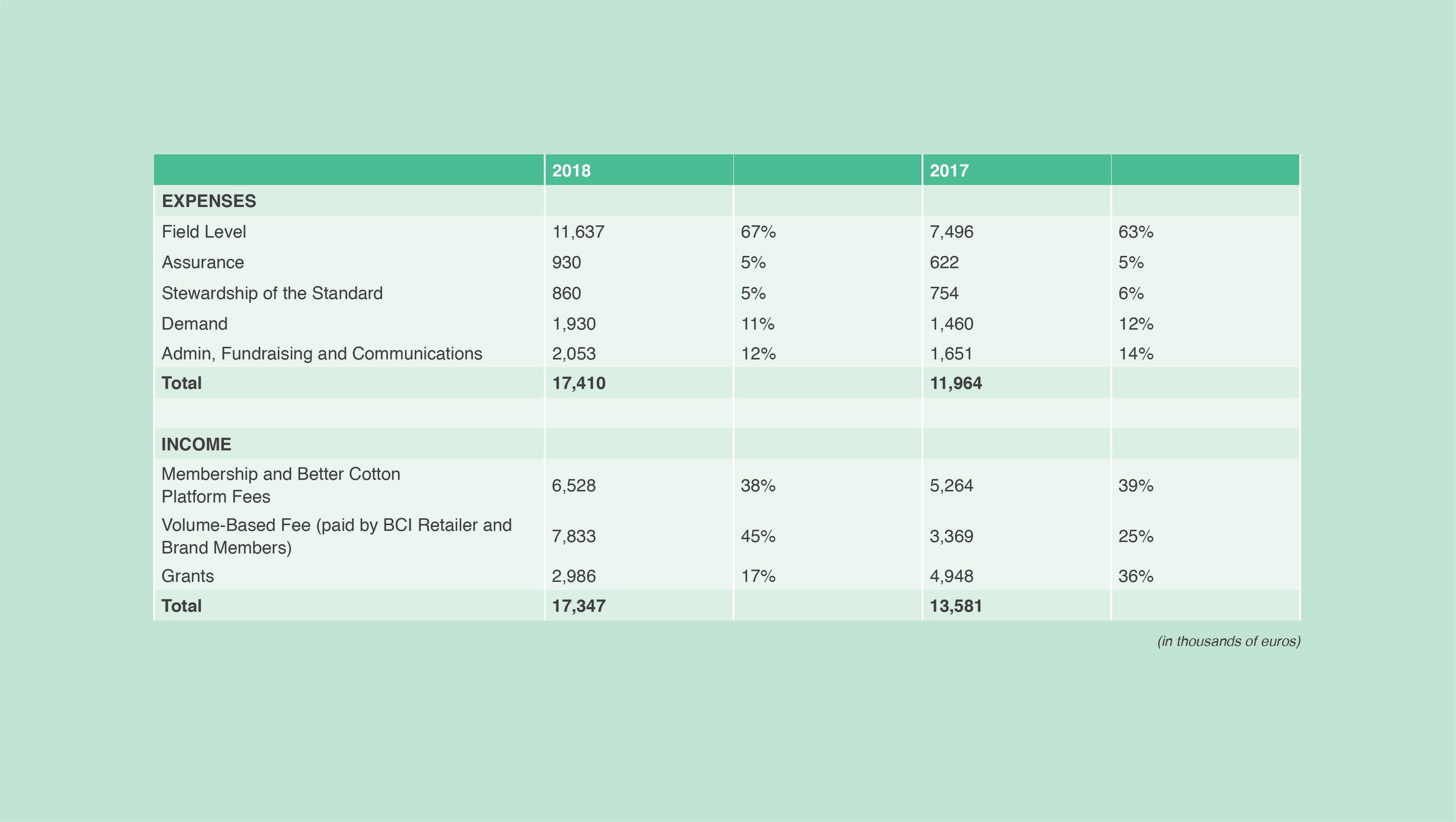 In 2018, BCI membership continued to rise, and the total number of users of the Better Cotton Platform (our digital system that records the volumes of Better Cotton entering and travelling along the supply chain) reached 2,000 by the end of the year. The Volume-Based Fee continues to be an important financial mechanism for BCI. BCI Retailer and Brand Members pay this fee based on the volume of Better Cotton they source. The funds are primarily allocated to the Better Cotton Growth and Innovation Fund for field-level training and support.