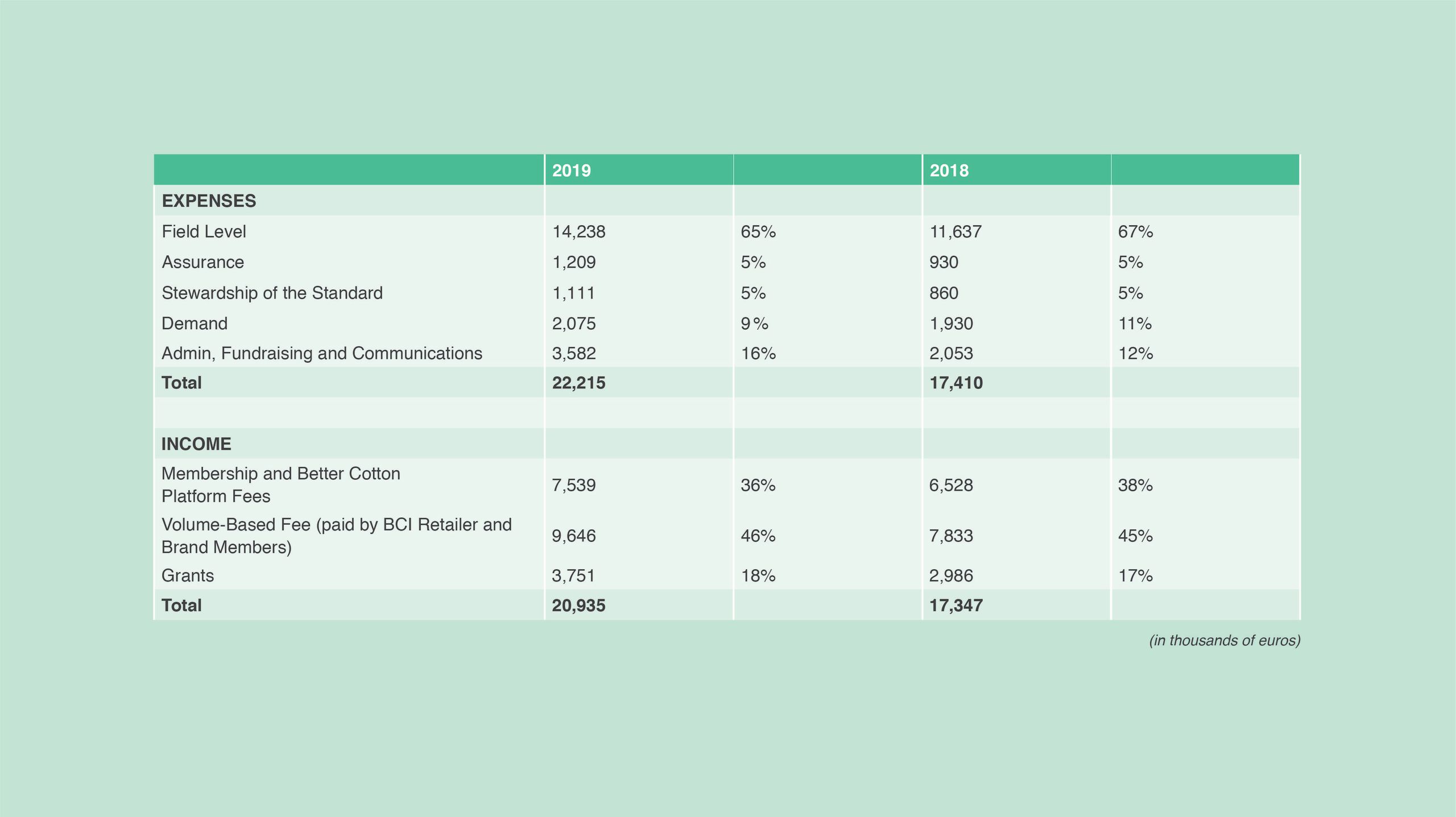 Below we have highlighted the sources of our funding and where it was allocated in 2019. This includes the combined income of the Better Cotton Initiative and the Better Cotton Growth and Innovation Fund. The financial data summarised below does not constitute a statutory set of financial statements. To receive a copy of these, please contact [email protected].